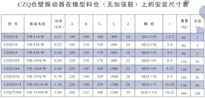 用途: 倉壁振動器是一種以振動電機為激振源的一種新型防閉塞裝置,將該裝置安裝于各種料倉上,通過振動可使料倉中結(jié)拱的物料發(fā)生變位運動,從而起到解拱作用。 振動電機是一種動力源和激振源合為一體的理想激振源,由于振動電機的整個結(jié)構(gòu)是密閉的,因此裝在粉塵作業(yè)的設(shè)備上能正常使用,由于電機線圈的絕緣處理較嚴(yán)格,使用環(huán)境溫度在80℃內(nèi)能繼續(xù)工作。 料倉和卸料管裝上倉壁振動器效果非常明顯,閉塞現(xiàn)象即可消除;但由于料倉和卸料管中儲藏的物料情況十分復(fù)雜,倉壁振動器在料倉設(shè)備中的應(yīng)用規(guī)律確實難以掌握,本文僅提供一些選擇參數(shù)供應(yīng)用者參考。 型號說明:
