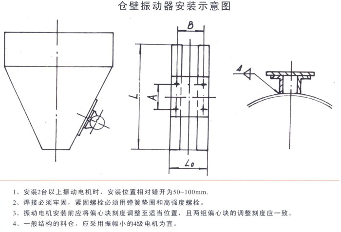 使用說明: 1、安裝2臺以上振動電機時,安裝位置相對錯開為50~100mm。 2、焊接必須牢固,緊固螺栓必須用彈簧墊圈和高強度螺栓。 3、振動電機安裝前應(yīng)將偏心塊刻度調(diào)整至適當(dāng)位置,且兩組偏心塊的調(diào)整刻度應(yīng)一致。 4、一般結(jié)構(gòu)的料倉,應(yīng)采用振幅小的4級電機為宜。 參數(shù):